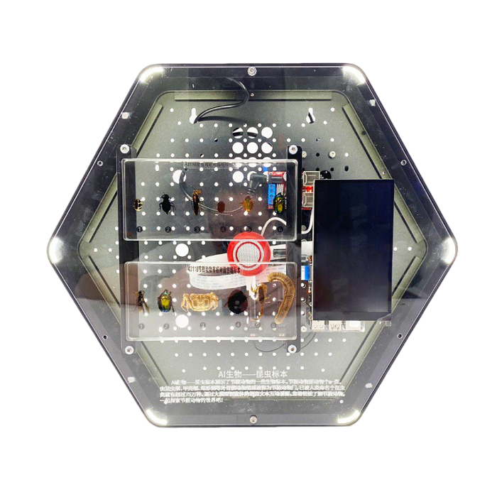 Интерактивный модуль для оформления зон рекреации, кабинетов, IT-полигона, библиотеки, медиа зоны. Благодаря интеллектуальному голосовому и текстовому взаимодействию ИИ вы можете легко узнать об биологических образцах членистоногих, а также более детально изучить машинное обучение, базы данных, коммуникацию и алгоритмы ИИ. Модуль выполнен в форме шестиугольной призмы с интерактивным наполнением.