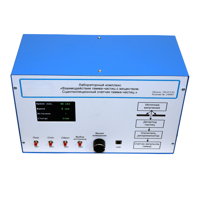 Стенд «Взаимодействие гамма-частиц с веществом. Сцинтилляционный счетчик гамма-частиц» содержит микропроцессорную систему с органами управления экспериментом и с выводом информации на графический ЖК дисплей.
